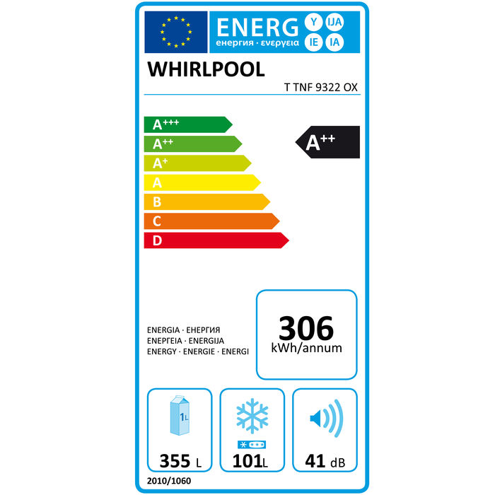 This Whirlpool freestanding double door features: inox color. Optic Inox design with anti-fingerprint protection. No frost, frost free technology, that effectively prevents ice build-up in your Freezer, by reducing humidity levels. A tall appliance to fit your family needs. Glass shelves with profile fronts, providing robustness, elegance and extra safety.
